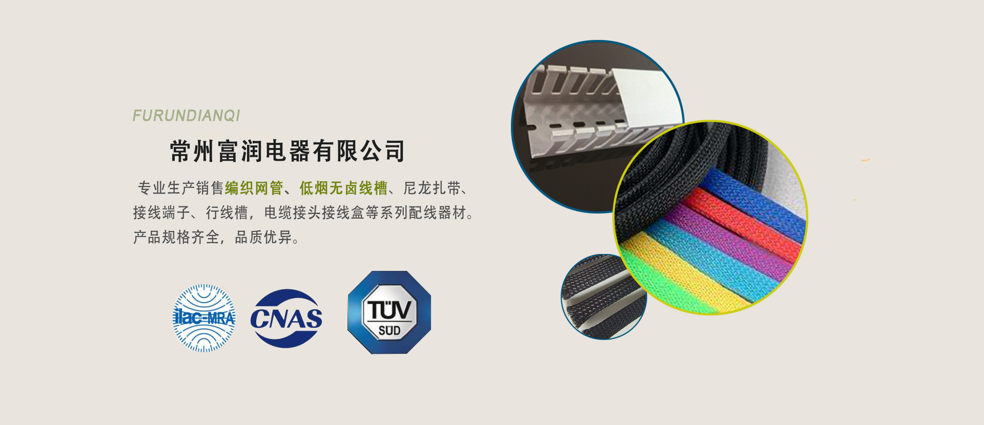 常州富潤電器有限公司專業(yè)生產(chǎn)、銷售編織網(wǎng)管、尼龍?jiān)鷰А⒔泳€端子、行線槽,電纜接頭接線盒等系列配線器材···